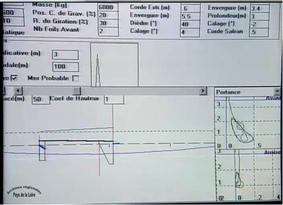 Hydroptère navigant hors de l’eau et écran de suivi de navigation (extraits de films de présentation, 1992 et 2000).